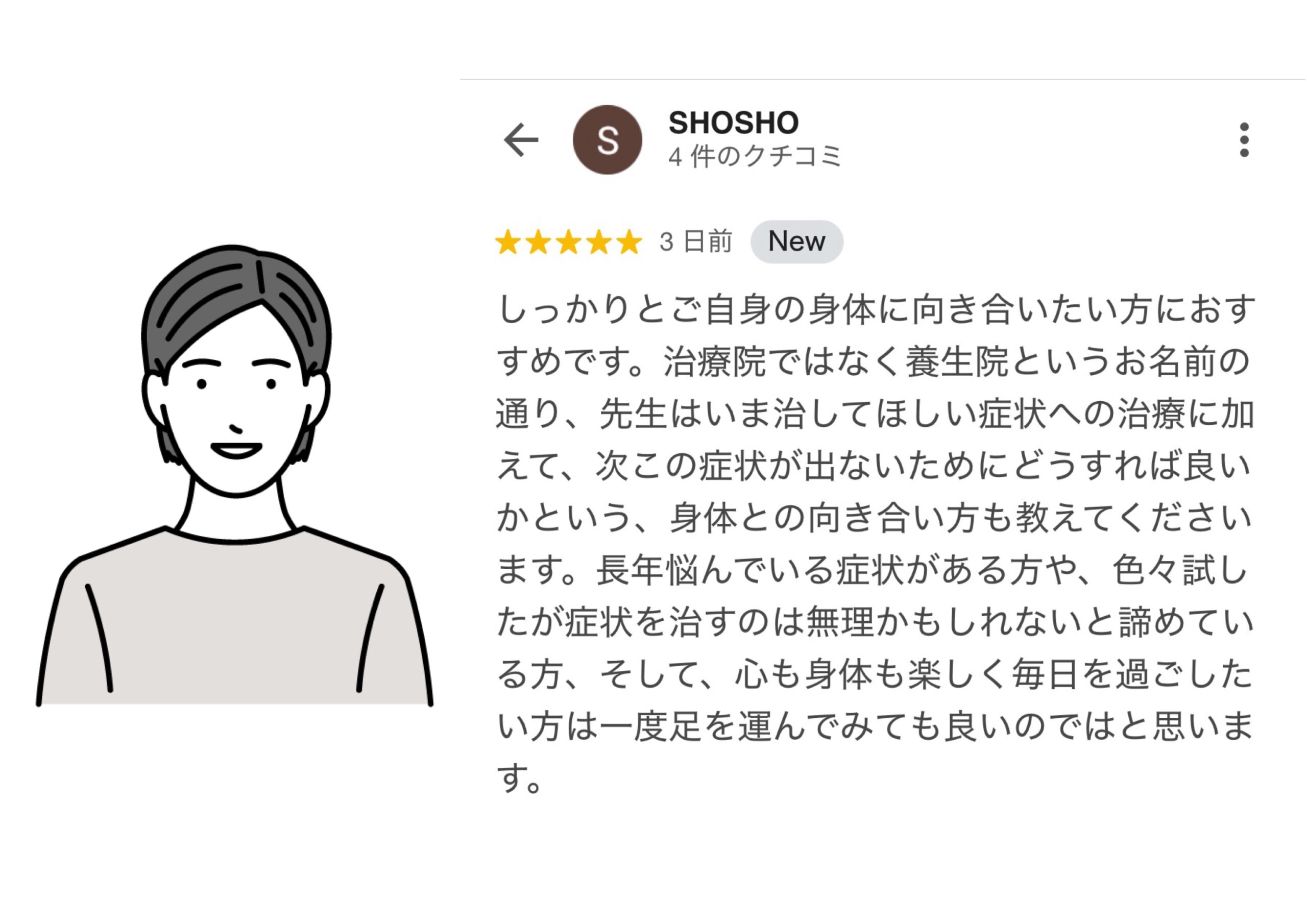 しっかりとご自身の身体に向き合いたい方におすすめです。治療院ではなく養生院というお名前の通り、先生はいま治してほしい症状への治療に加えて、次この症状が出ないためにどうすれば良いかという、身体との向き合い方も教えてくださいます。長年悩んでいる症状がある方や、色々試したが症状を治すのは無理かもしれないと諦めている方、そして、心も身体も楽しく毎日を過ごしたい方は一度足を運んでみても良いのではと思います。
