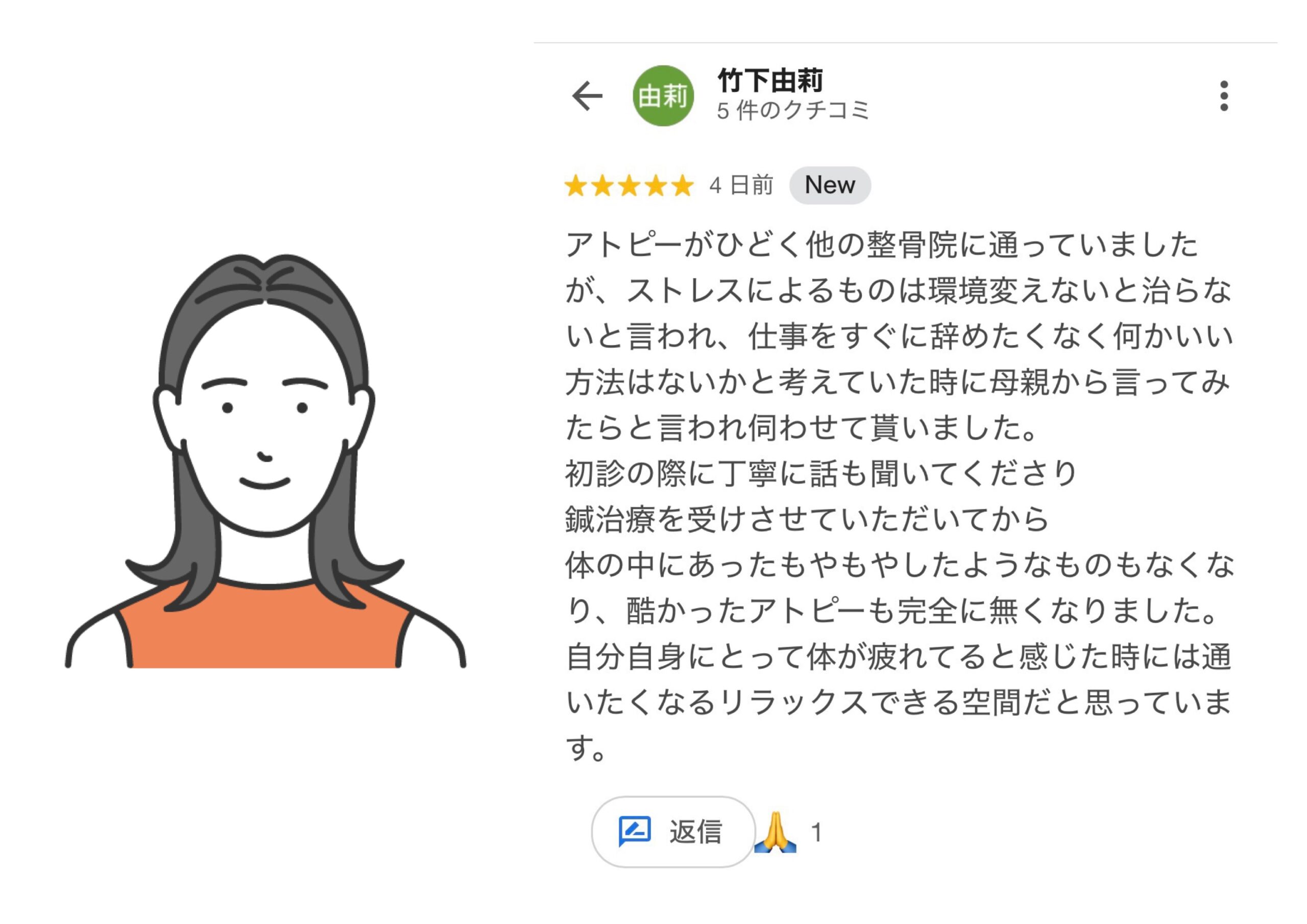 アトピーがひどく他の整骨院に通っていましたが、ストレスによるものは環境変えないと治らないと言われ、仕事をすぐに辞めたくなく何かいい方法はないかと考えていた時に母親から言ってみたらと言われ伺わせて貰いました。